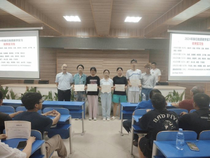 在表彰环节,大会对三个学院各班级的优秀实习生及三位优秀实习教师进行了表彰,以嘉奖他们在实习中的突出表现与责任担当。尤为值得关注的是,现场特别向颜佳新老师颁发秭归 “终身成就奖”,致敬其在地质实践教学领域的长期坚守与卓越贡献。