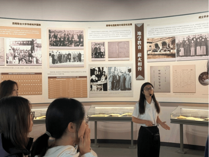 走进第一展区,西南联大时期地质学科的办学历史徐徐展开。文献资料与老照片等珍贵展品,生动勾勒出战乱年代地质先辈坚守办学的峥嵘岁月。“西南联大地质师生在艰苦环境中从未放弃学术研究与人才培养,这正是抗战精神中‘文化不灭’的生动体现。” 团支书结合展品娓娓道来,并适时抛出问题:“西南联大地质师生的坚守和抗战精神有什么关联?” 问题引发团员们热烈讨论,李爽同学谈到:“在民族危难之际,他们以知识为武器,守护文化火种,这种坚韧与担当,和抗战时期军民奋勇抗争的精神一脉相承,都是对民族使命的践行。” 现场交流氛围浓厚,使“铭记抗战胜利,传承红色基因”的主题学习更加具象而深刻。
